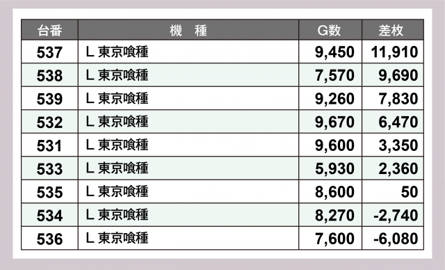 それに負けていなかったのが『L 東京喰種』。537番台が5桁のプラスを叩き出し、その他にも大量獲得台が複数見受けられた。