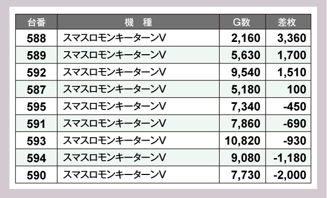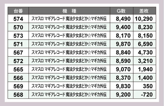 そんな中、最もプレイヤーの注目を集めたのが『スマスロ マギアレコード 魔法少女まどか☆マギカ外伝』で、574番台が怒涛の+10,290枚を叩き出していた。また、10台中9台がプラスで平均+4,400枚といった大満足の結果となった。