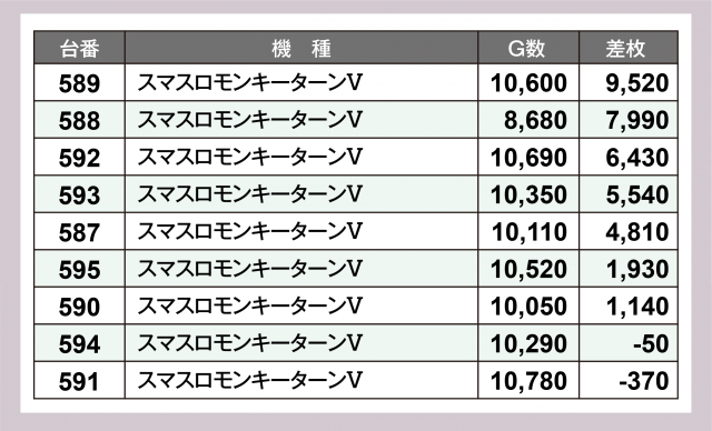 この日は『スマスロモンキーターンⅤ』に1点集中で注目。多くの台で5桁のゲーム数を計上する中、589番台の+9,500枚をシマの頂点に、+8,000枚弱、+6,400枚超、さらに+5,500枚超と素晴らしい成績が相次いだ。