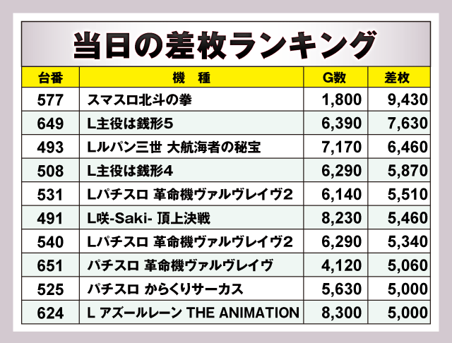 当日は『スマスロ北斗の拳』577番台の+9400枚をはじめ、『L主役は銭形5』649番台が+7,600枚、『Lルパン三世 大航海者の秘宝』493番台が+6,400枚など好結果を残すスマスロが多数登場した。