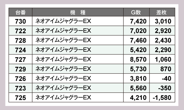 またメダル機に目を向けると、『ネオアイムジャグラーEX』では730番台の+3,000枚超など全9台中6台がプレイヤーの勝利となる好結果をマークした。