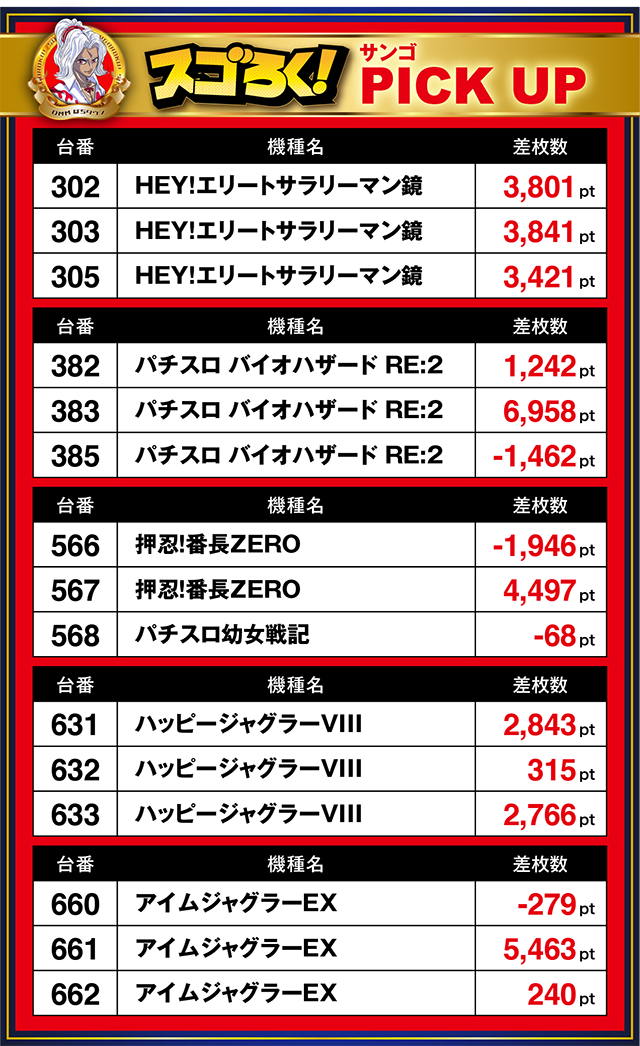 「アイムジャグラーEX」の660番台から662番台までもお気に入りで、5,000ptを超えた台もあったぞ。