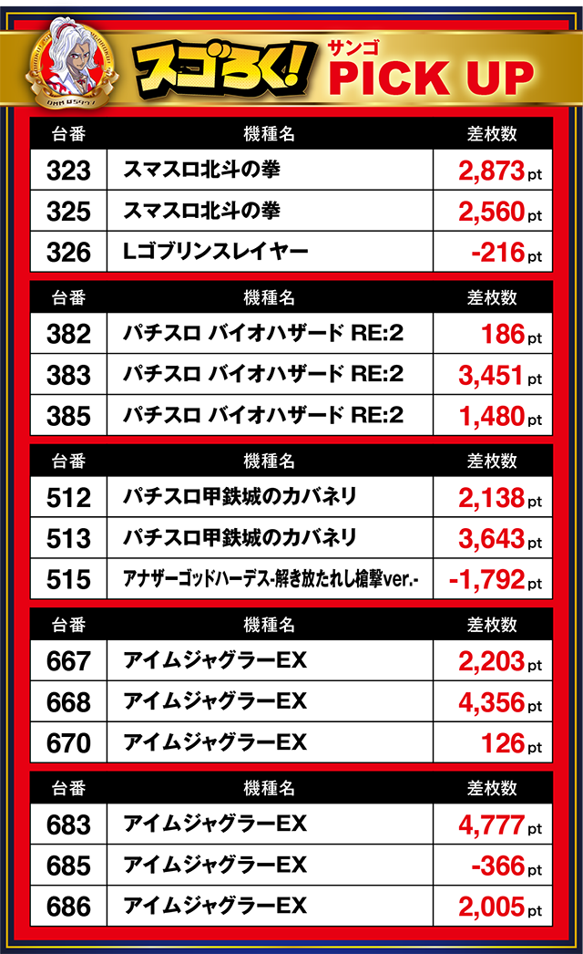 選んだ台はどれも結果がよく、383番台は3,451pt、385番台は1,480ptを記録。