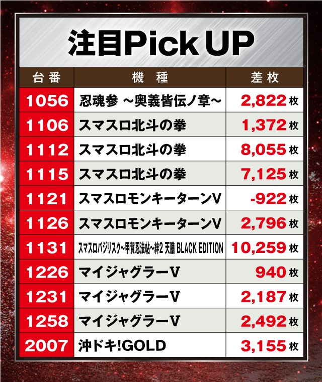 特に注目を集めていたのが『スマスロバジリスク~甲賀忍法帖~絆2 天膳 BLACK EDITION』。なんと+10,259枚と万枚オーバーを達成していた!