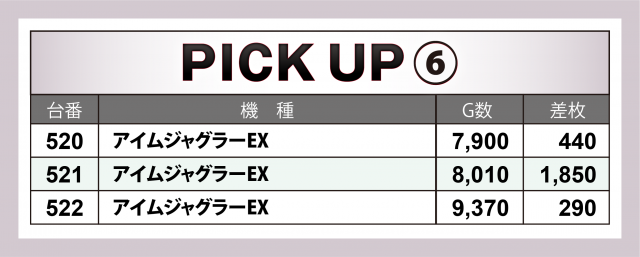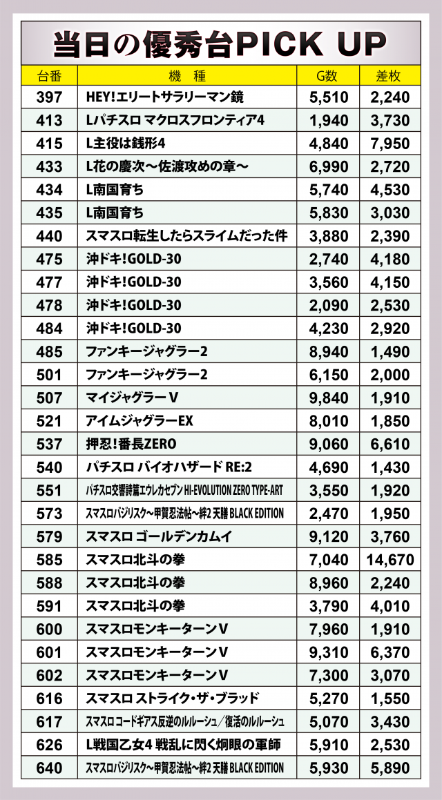 しかし万枚突破台の存在や上位30台の成績を考えると全台の合計が一見不可解に思える。この状況から推測するにプラス台とマイナス台のメリハリが効いた営業が行われていた思われる。同店で勝利に向かうなら、大きな負債を抱える前に優秀台にいち早く着席することが鉄則となるだろう。