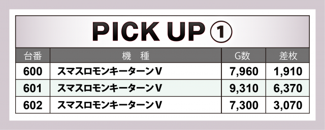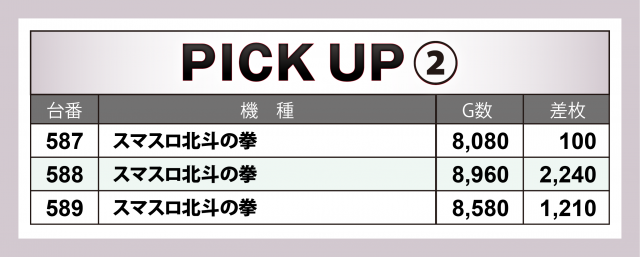 後ほど挙げる横並びスポット以外では、なんといっても『スマスロ北斗の拳』585番台が+1万5千枚弱を記録。次いで差枚数の多い順に『L主役は銭形4』が+8千枚弱、『押忍!番長ZERO』が+6千6百枚超、『スマスロバジリスク~甲賀忍法帖~絆2 天膳 BLACK EDITION』が+5千9百枚弱をゲットした。