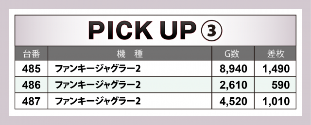 その中で特に目立ったのが3台全てが1,000over&トップが+6千4百枚弱となった『スマスロモンキーターンⅤ』。その他『スマスロ北斗』や『ファンキージャグラー2』では+2千枚超が1台ずつカウントされた。