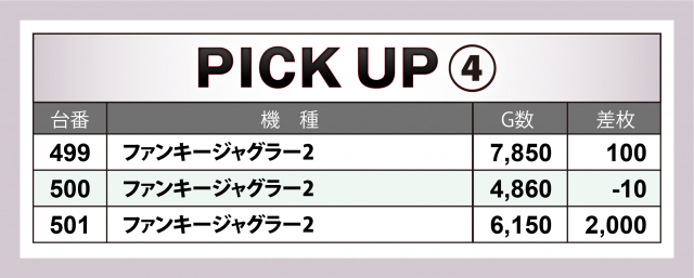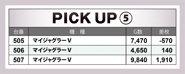 続いては5機種計18台の横並び好況スポットに注目。18台のうち16台が勝利を成し遂げ、16台のうち6割強となる10台が4桁プラスに成功した。