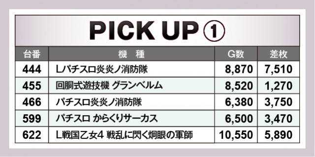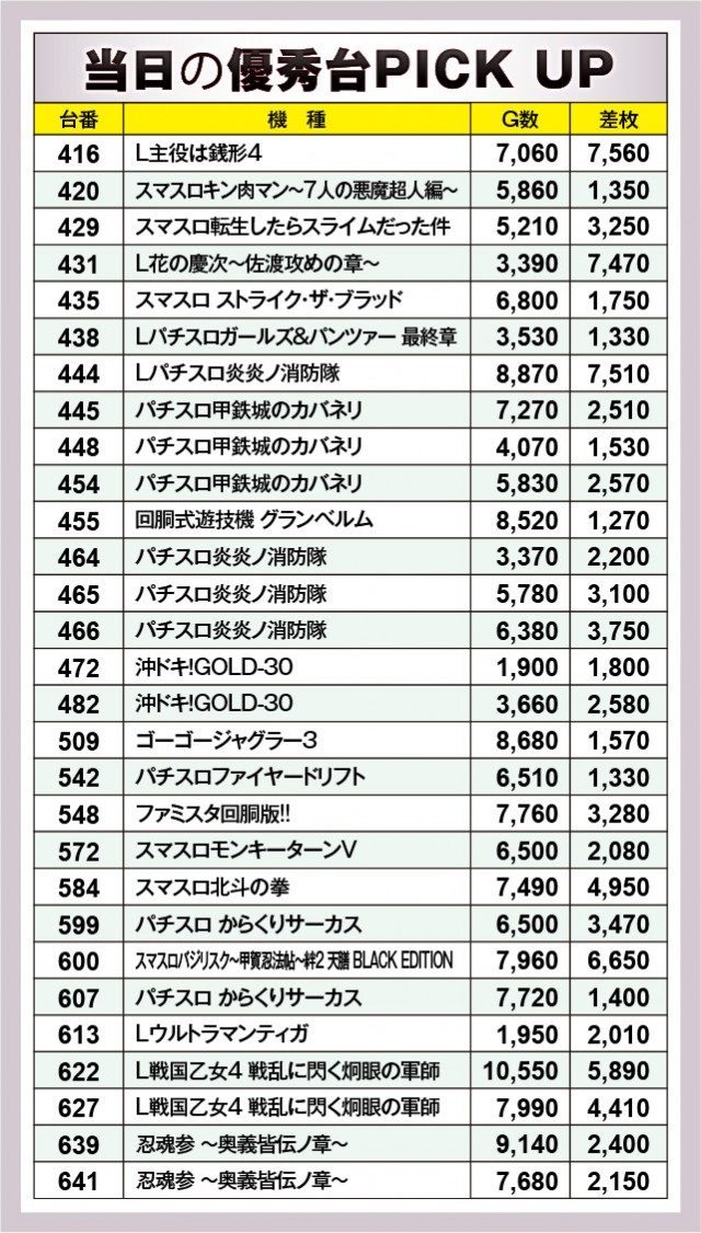『L主役は銭形4』416番台+7,560枚や『Lパチスロ炎炎ノ消防隊』444番台+7,510枚といった記録が見られ、しっかりとポテンシャルを解き放っていた台を確認できる。他にも大台突破台こそもあるが、全体的に物足りない数字なのは否めないだろう。ただ回転数を見れば、『L戦国乙女4 戦乱に閃く炯眼の軍師』の万回転OVER台を筆頭に、8千回転前後を記録する台が多いことから、手ごたえを感じていたファンは少なくないようだ。