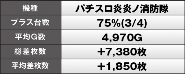 スマスロ版が登場して間もないが、『パチスロ炎炎ノ消防隊』が兄弟機に負けない活躍を披露していた。プラス台は4台中3台となっており、しっかりと盛り上がりを形成していたのが印象に残る。そして平均差枚数+1,850枚となっており、各台がまとまった出玉を獲得していたのが容易に想像できるばかりだ。