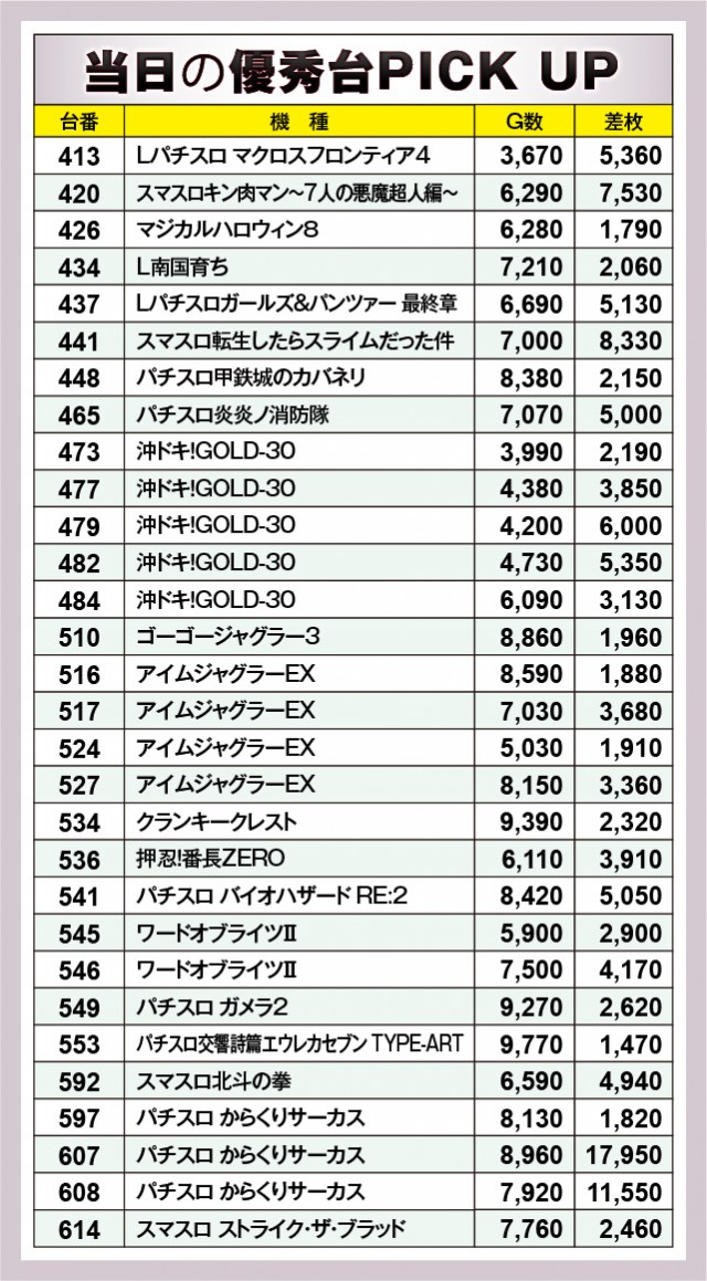 『パチスロ からくりサーカス』607番台+17,950枚・608番台+11,550枚と、同機種から2台の万枚OVER台が生まれている。ほかにも『スマスロキン肉マン~7人の悪魔超人編~』420番台+7,530枚や『スマスロ転生したらスライムだった件』441番台+8,330枚と高い熱を放つ台もあり、これら機種が当日の盛り上がりをリードしていた。『沖ドキ!GOLD-30』も多くの名前が連なっており、活気に溢れていた様子が窺える。