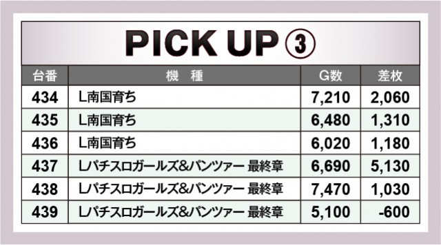 『アイムジャグラーEX』を中心に横並び好況スポットが形成され、各所でコンスタントな大当りが発生していた。そのなかで517番台+3,680枚・527番台+3,360枚と気を吐く活躍も見られ、牽引する存在となっていた様子が窺える。また『Lパチスロガールズ&パンツァー 最終章』437番台+5,130枚という数字も見逃せず、各エリアがしっかりと熱を放っていたようだ。