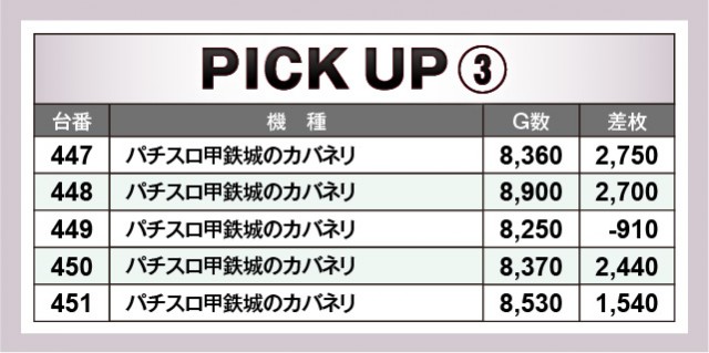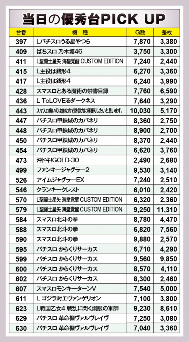 『スマスロ北斗の拳』や『パチスロ からくりサーカス』、『パチスロ甲鉄城のカバネリ』など、主に人気機種が中心となって盛り上がりを形成していた印象を受ける。そして『ファンキージャグラー2』はコンスタントなボーナス当選を披露し、しっかりとプラス差枚数を築いているのも見逃せない。これら4ヶ所の横並び好況スポットが高い活気と熱気を作り上げ、ファンは満足度の高い1日を過ごしていたことだろう。