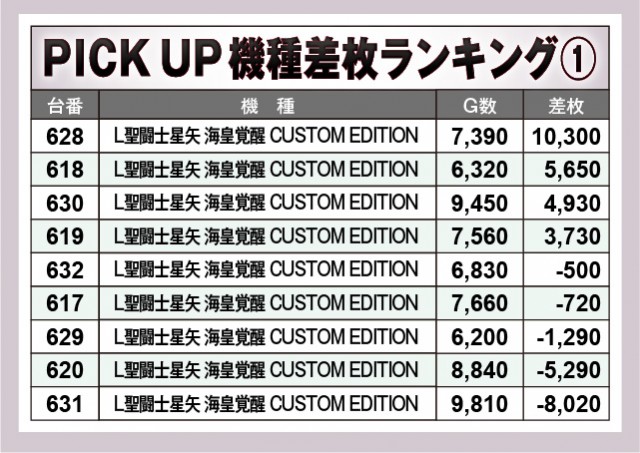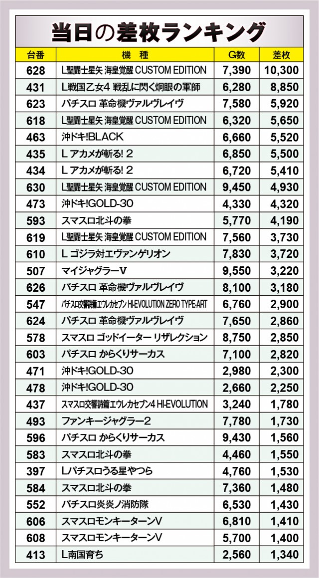 『L聖闘士星矢 海皇覚醒 CUSTOM EDITION』から万枚OVERが発生し、店内の盛り上がりをリードする存在となった。また『L戦国乙女4 戦乱に閃く炯眼の軍師』も8,000枚OVERを記録しており、ほかにも5,000枚OVERが多々見られたことから、大きな熱気に包まれたと言えるだろう。ファンが自信を持ってレバーを叩いていた様子は、消化されたゲーム数からも窺えるはずだ。