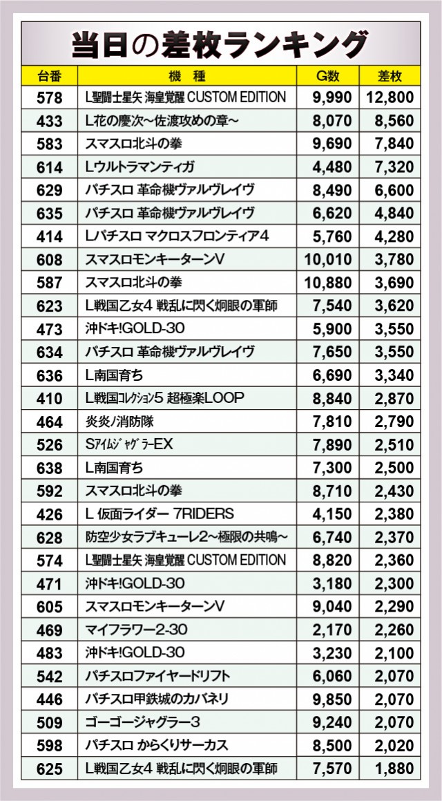 上表をご覧の通り、『L聖闘士星矢 海皇覚醒 CUSTOM EDITION』にて万枚OVERという盛り上がりが発生した。それ以上に印象的なのは、多くの機種で8~9千回転台をマークしており、ファンが相当な手応えを感じていた事実だ。回転数と差枚数が比例する展開が顕著で、有意義な時間を過ごしていたのは間違いない。
