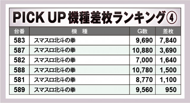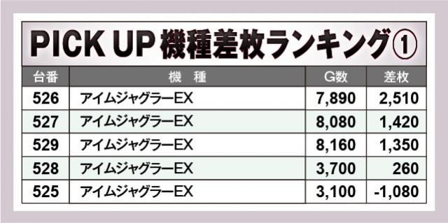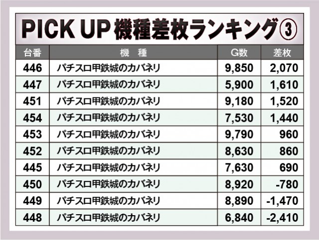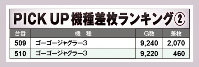 『パチスロ甲鉄城のカバネリ』『スマスロ北斗の拳』と人気AT機が軒並み活躍しており、プラス差枚数が目立っていたのが鮮烈である。また一方で『ジャグラー』シリーズも負けておらず、『ゴーゴージャグラー3』は全台プラス差枚数を達成した。その回転数から読み取れるように、やはりファンが相当な好感触を得ていたのは確かだ。