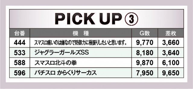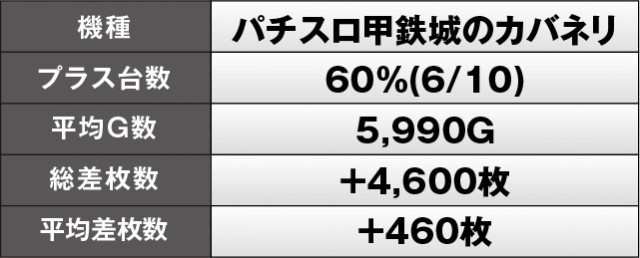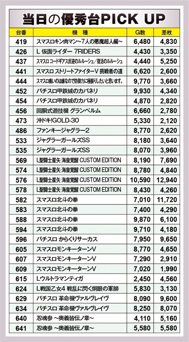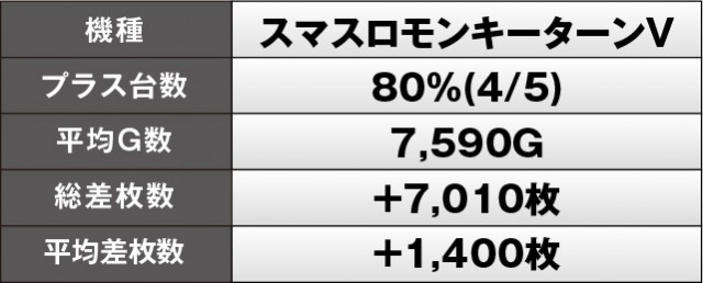 『パチスロ甲鉄城のカバネリ』『スマスロモンキーターンV』は機種単位での盛り上がりを披露しており、ファンはレバーを叩く喜びを感じていたはずだ。特に後者は開店から閉店まで打ち込まれた形跡を見て取ることができ、相当な好感触を得ていたのではないだろうか。平均差枚数+1,400枚という数字も上々で、明らかな活気と熱気を見せていた。