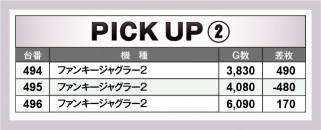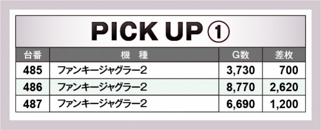 『ファンキージャグラー2』485~487番台・494~496番台と、同機種から2か所の横並び好況スポットを確認できた。派手な数字こそ残してはいないが、安定感のあるパフォーマンスで充実の時間を過ごせたエリアとなっている。486番台+2,620枚とコンスタントなボーナス当選は、口角を緩ませていたに違いない。