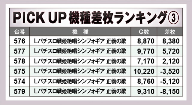 全体的に高い回転数を記録しており、その中で『マイジャグラーⅤ』『スマスロ北斗の拳』の2台が万回転OVERを達成しているのが印象的だ。そして登場したばかりの新台がさっそく活躍しており、『Lパチスロ戦姫絶唱シンフォギア 正義の歌』『スマスロ真・北斗無双』が大台を突破している。人気機種の盛り上がりも見逃せず、館内全体で盛り上がっていたと言えるだろう。