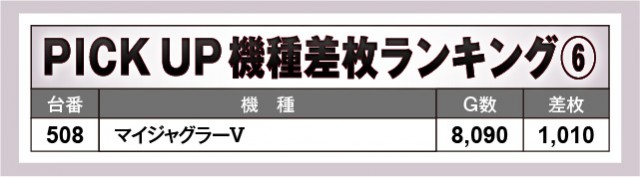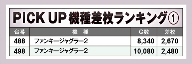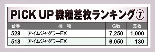 万回転OVERを達成した機種は上表から3台確認でき、『スマスロモンキーターンV』からは2台も生まれている。さらには終日を通して打ち込まれており、大きなマイナスもないことから、相当な手応えを感じられたはず。それは他機種も同様で、特に『ジャグラー』シリーズは回転数と差枚数が比例する展開が鮮烈であるばかりだ。
