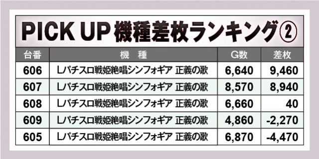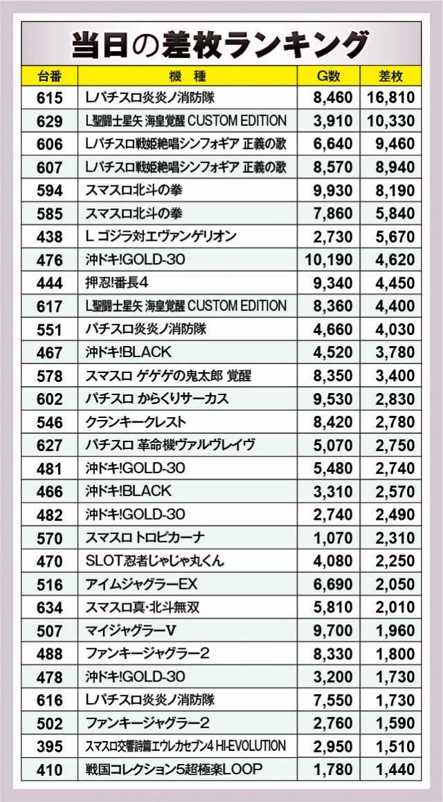 万枚OVERを達成した『Lパチスロ炎炎ノ消防隊』『L聖闘士星矢 海皇覚醒 CUSTOM EDITION』は、やはり高い存在感を示していたのが分かる。特に後者は8~9,000枚OVERと勢いが凄まじく、遊技していたファンは好感触を得ていたはずだ。それは回転数の大きさからも分かる部分で、同店がしっかりと力を入れていたのが窺える。