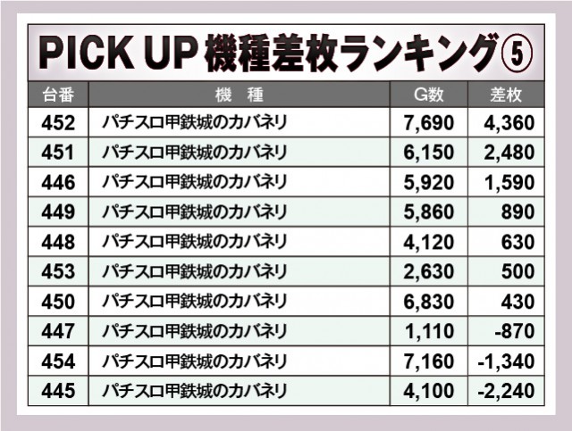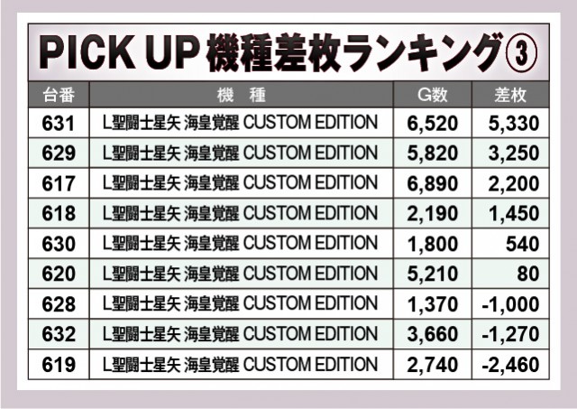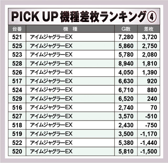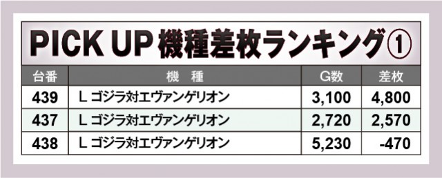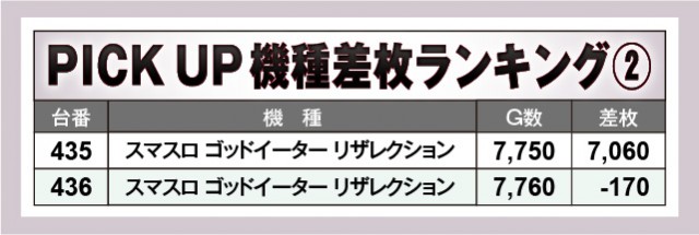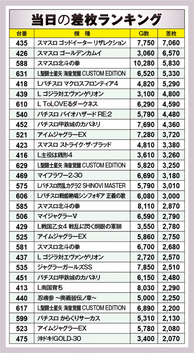 『スマスロ ゴッドイーター リザレクション』は特に回転数をマークしており、その中で7,000枚OVERが発生。そして『L聖闘士星矢 海皇覚醒 CUSTOM EDITION』では5,000枚OVER、『L ゴジラ対エヴァンゲリオン』『パチスロ甲鉄城のカバネリ』でも4,000枚OVERも生まれており。また『アイムジャグラーEX』は回転数と差枚数が比例する展開を披露しており、打ちごたえのある状況が整っていたようだ。