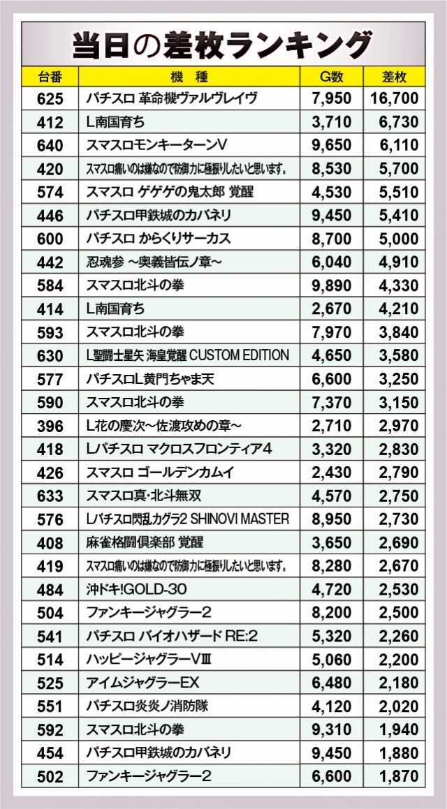 『パチスロ 革命機ヴァルヴレイヴ』から16,700枚という凄まじい熱気が放たれ、店内の盛り上がりを大きくリードしてくれた。大台突破台がほかにも見られ、ファンはまとまった出玉を前に高揚感を抑えきれなかったはずだ。また回転数を見れば閉店まで打ち込まれた形跡を確認でき、ファンは相当な手応えを感じていた様子も見て取れるばかりだ。