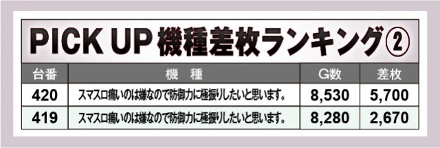 『スマスロ痛いのは嫌なので防御力に極振りしたいと思います。』は全台プラス差枚数を達成しており、回転数を見ても閉店まで打ち込まれていることから、好感触を得ていたのは間違いない。それは『スマスロ北斗の拳』『ファンキージャグラー2』も同様で、やはりファンが手応えを感じていた様子が窺えるばかり。『L南国育ち』も例に漏れず、高い熱気を放っていたのも見逃せない。