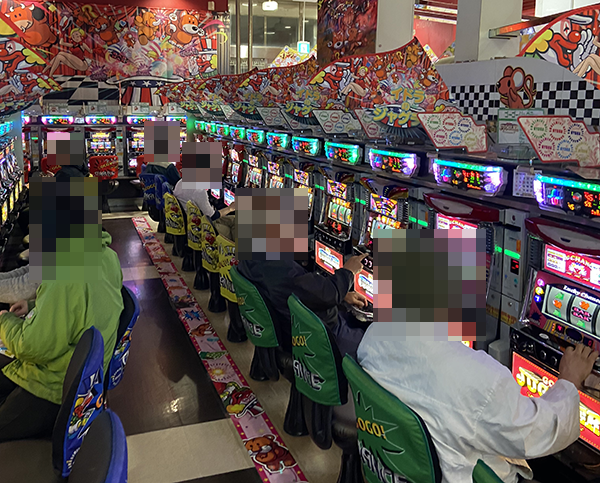 とくに活況となっていたのがパチスロコーナー。多くのプレイヤーがイキイキと遊技をおこなっていた。