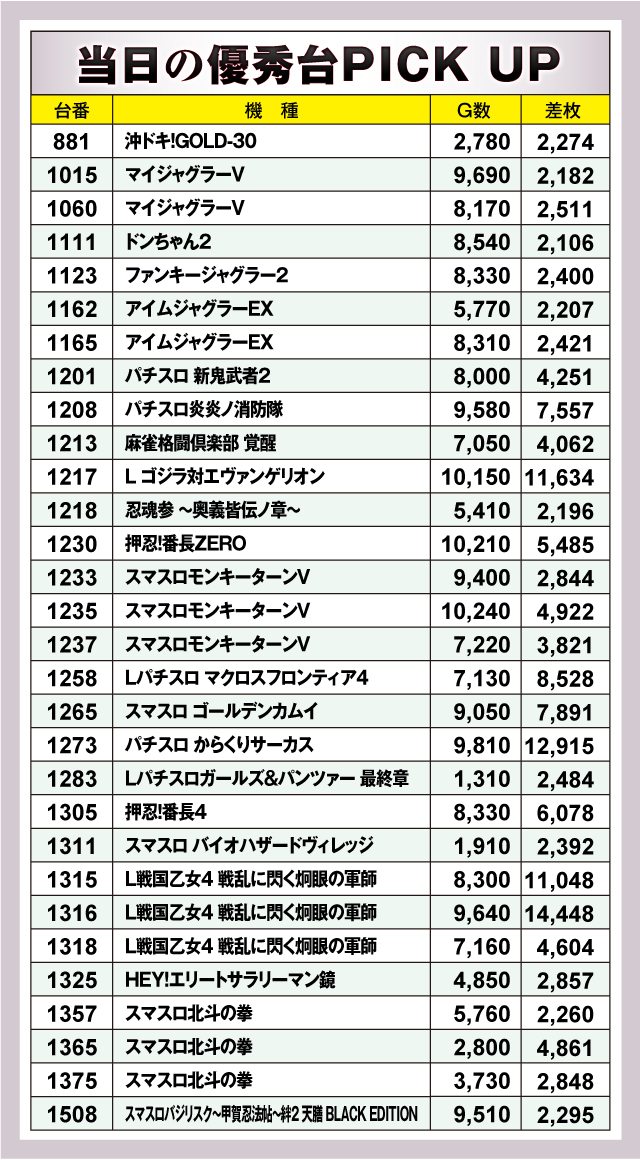 まずは優秀台30台の紹介から。30台すべてが+2,000枚オーバーで、+3,000枚オーバーは半数の15台出現。そして大台突破の+10,000枚オーバーは4台出現! それらのなかでもっとも優秀な成績を収めたのが、1316番台の「L戦国乙女4 戦乱に閃く炯眼の軍師」で、差枚+14,448枚と圧倒的! またランクイン台を詳しく見てみると、スマスロを筆頭に人気台が大半を占めており、ジャグラーシリーズも5台がランクイン! チャンスは幅広い機種に隠されていた可能性が高そうだ!