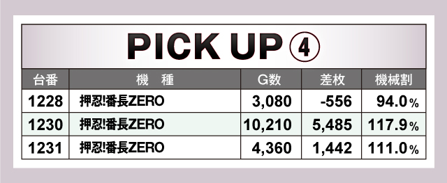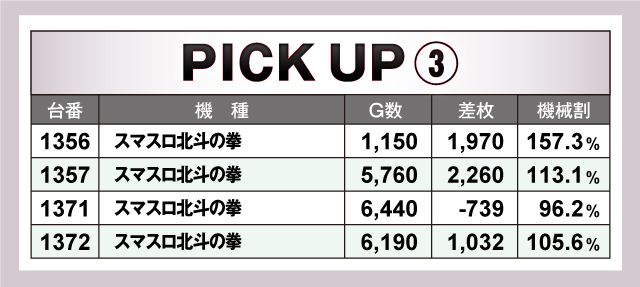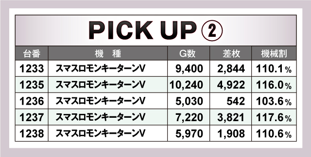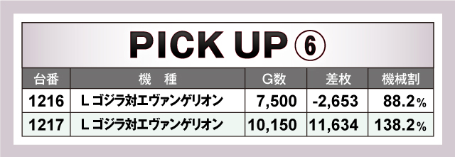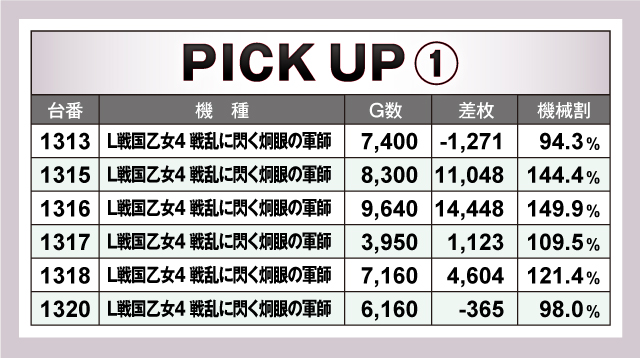 続いては、当日とくに賑わいを見せた6台〜2台並び6箇所を紹介していこう。6箇所全てがトータルプラスで終了しており、そのうち5箇所が平均差枚+2,000枚オーバー! それらのなかでも、1313番台〜1320番台の「L戦国乙女4 戦乱に閃く炯眼の軍師」の6台並びは、4/6台がプラス終了の平均差枚+4,931枚と圧倒的記録をマーク! その他の並びも優秀で、とくに1233番台〜1238番台の「スマスロモンキーターンV」は5台全台がプラスの平均差枚+2,807枚とこちらも素晴らしい結果を残していた!