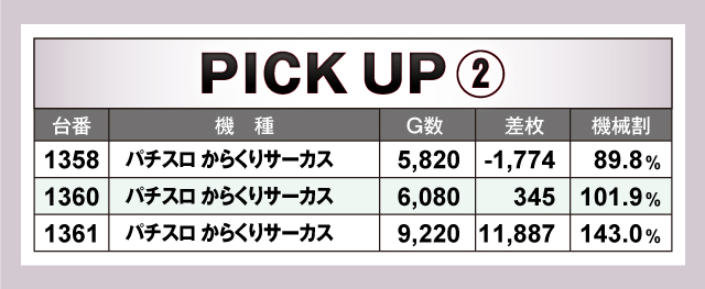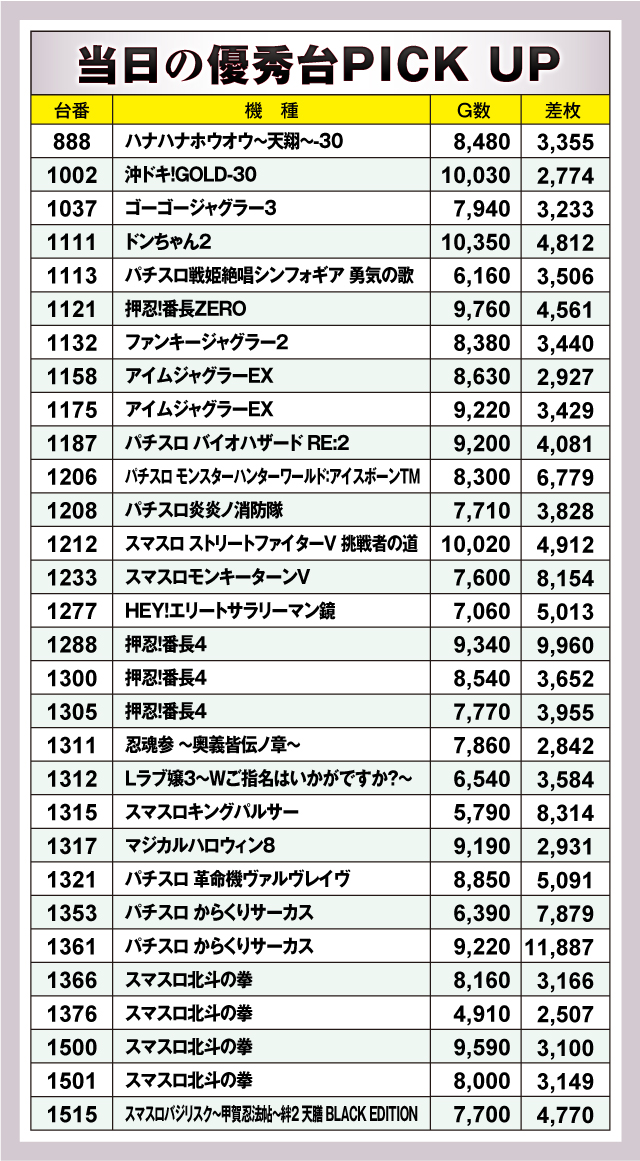 まずは優秀台30台のチェックから。30台すべてが+2,000枚オーバーを記録し、+3,000枚オーバーは25台出現。それらのなかでもっとも優秀だったのは、1361番台の「パチスロ からくりサーカス」で、差枚+11,887枚をマーク! またランクイン機種を見渡すと、スマスロが大部分を占めるなか、ジャグラーシリーズなどノーマルタイプも大量にランクインしていたので、店内の至る所にチャンスが隠されていた可能性が高そうだ!