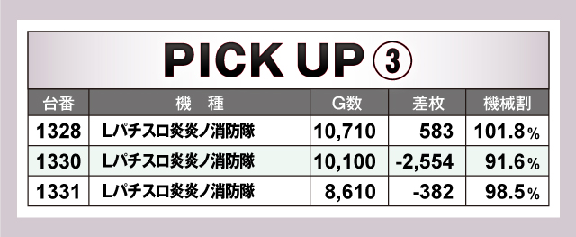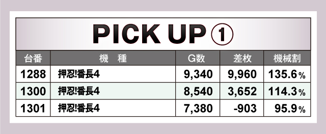 続いては、当日並びで賑わっていた6機種6箇所を紹介していこう。6箇所のうち5箇所がトータルプラスで終了しており、そのうち3箇所が平均差枚+2,000枚オーバー! なかでも1288番台〜1301番台の「押忍!番長4」の3台並びは、3台のうち2台がプラス終了の平均差枚+4,236枚と圧倒的な記録をマーク! その他並びにも良台を多数確認することができた!