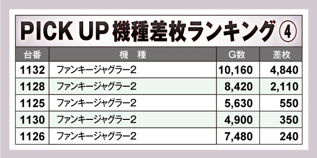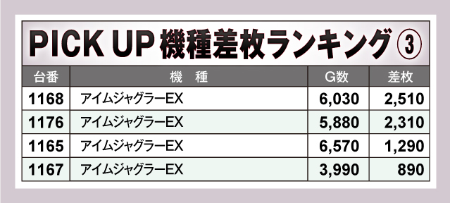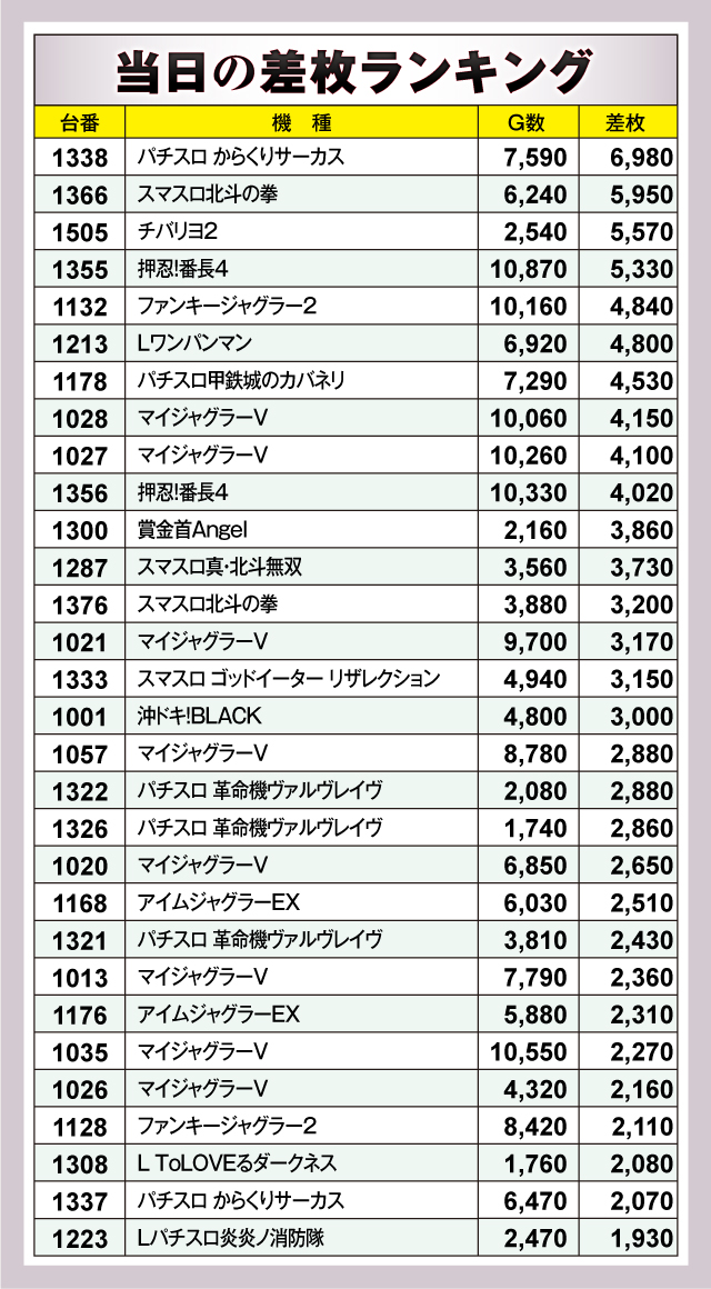 まずは差枚ランキングのチェックから。30台のうち29台が差枚+2,000枚オーバーで、+3,000枚オーバーは15台出現。それらのなかでもっとも優秀だったのは、1338番台の「パチスロ からくりサーカス」で、差枚は+6,980枚を獲得! またランクイン機種を見渡してみると、スマスロが大半を占めるなかまたジャグラーシリーズが12台もランクイン! ハイスペック機種からノーマルタイプまで幅広い機種にチャンスが隠されていたようだ!