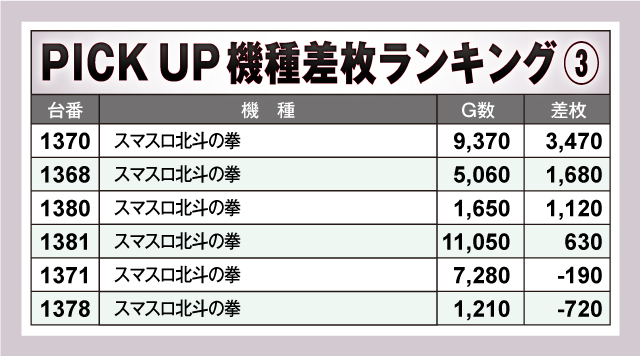 まずは差枚ランキングのチェックから。30台のうち27台が+2,000枚オーバーで、+3,000枚オーバーは16台出現。それらのなかでもっとも優秀だったのは、1323番台の「パチスロ 革命機ヴァルヴレイヴ」で、差枚は驚異の+12,580枚を獲得! またランクイン機種を見渡してみると、スマスロを筆頭に活躍を見せる中、ジャグラーシリーズが8/30台がランクイン。ハイスペック機種からノーマルタイプまで幅広い機種にチャンスが隠されていたようだ!