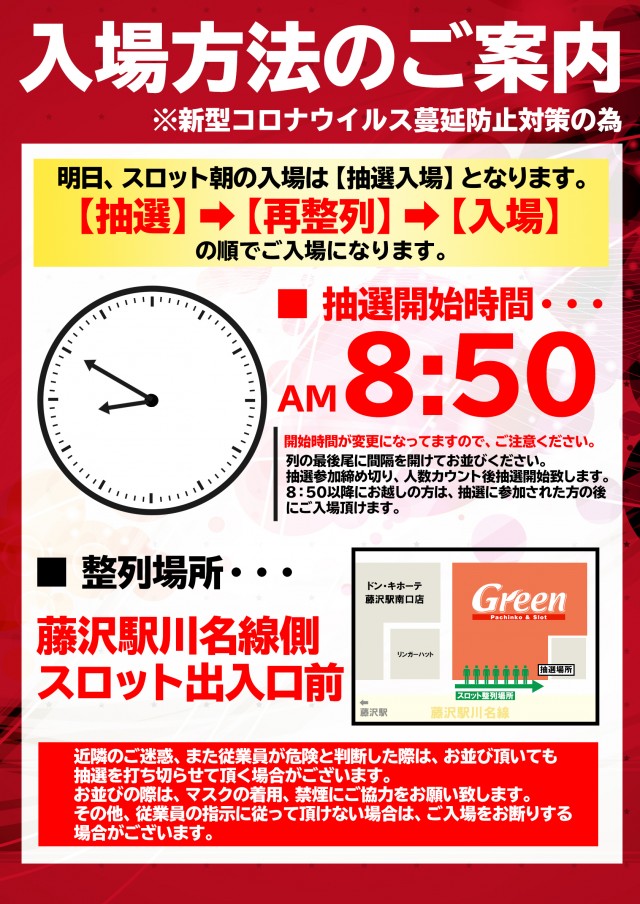 26日!9時開店!藤沢グリーン明日は抽選入場でのご案内です