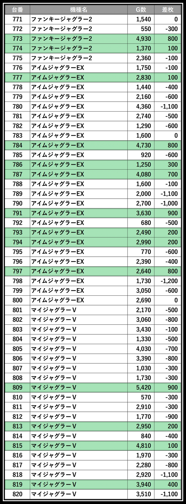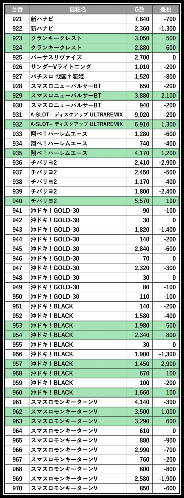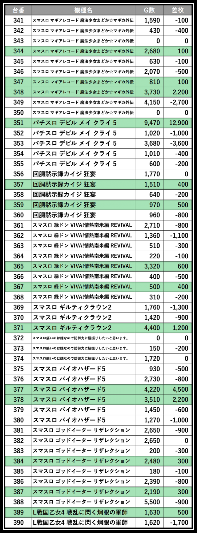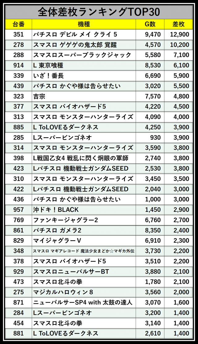 ※差枚数順に掲載しています