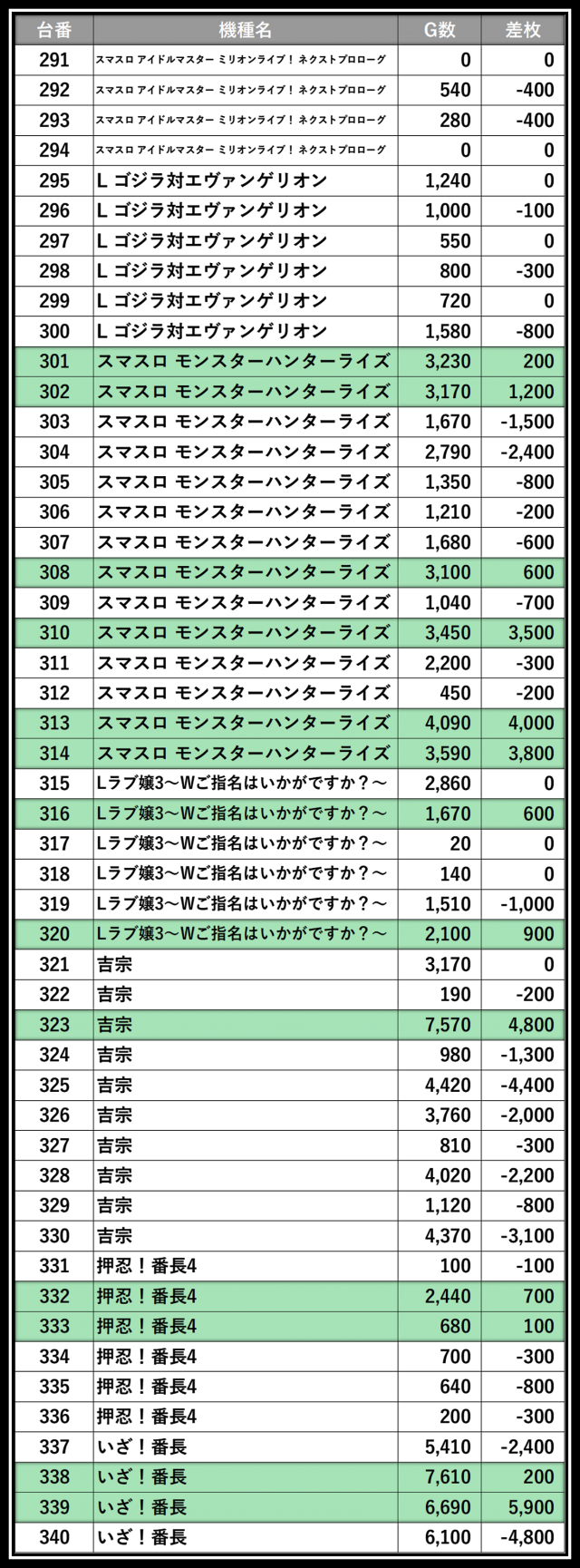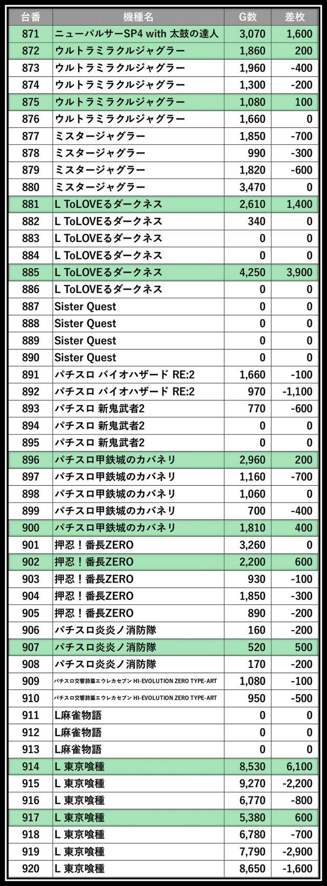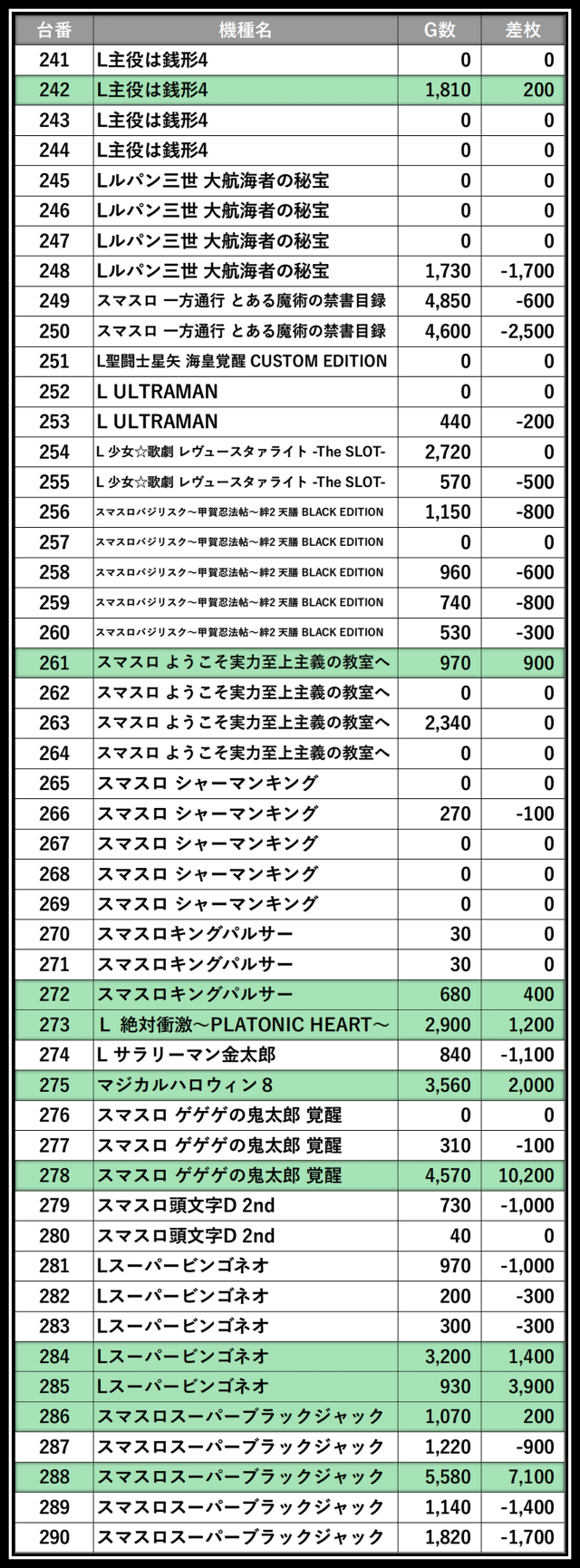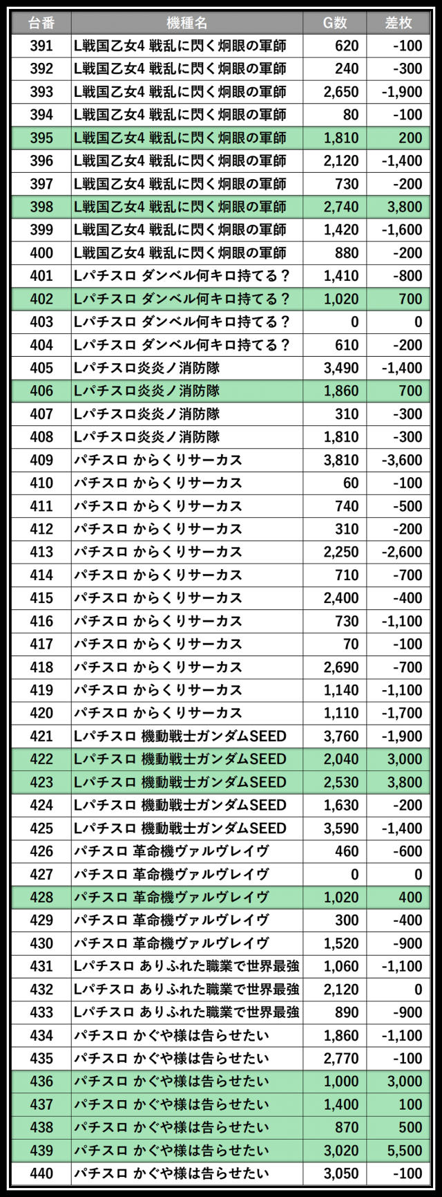 ※差枚数順に掲載しています