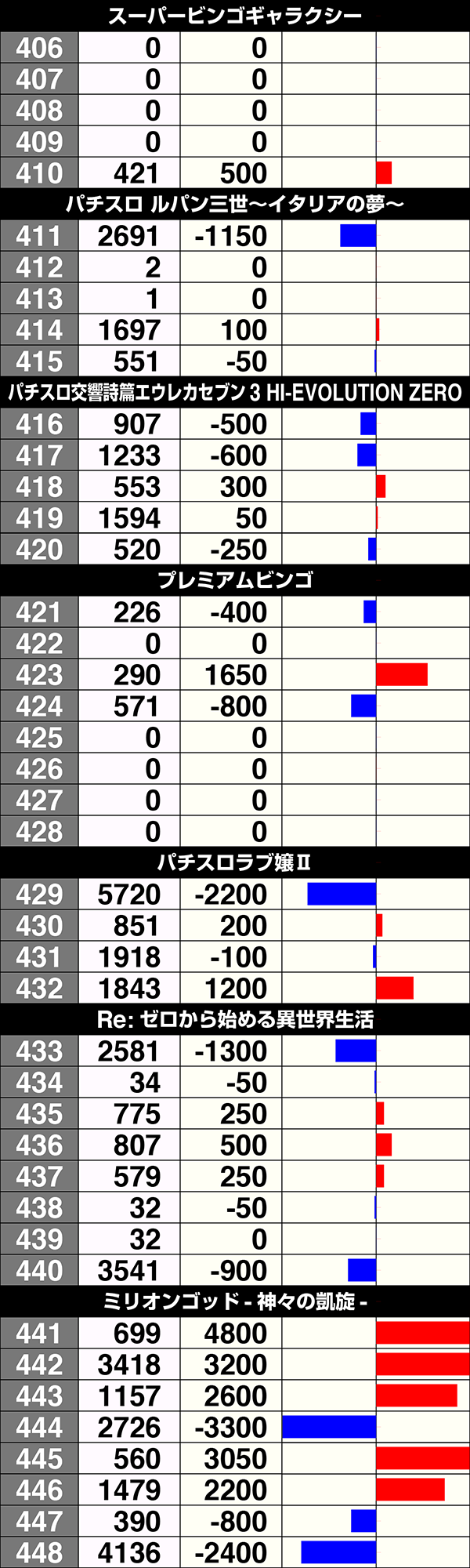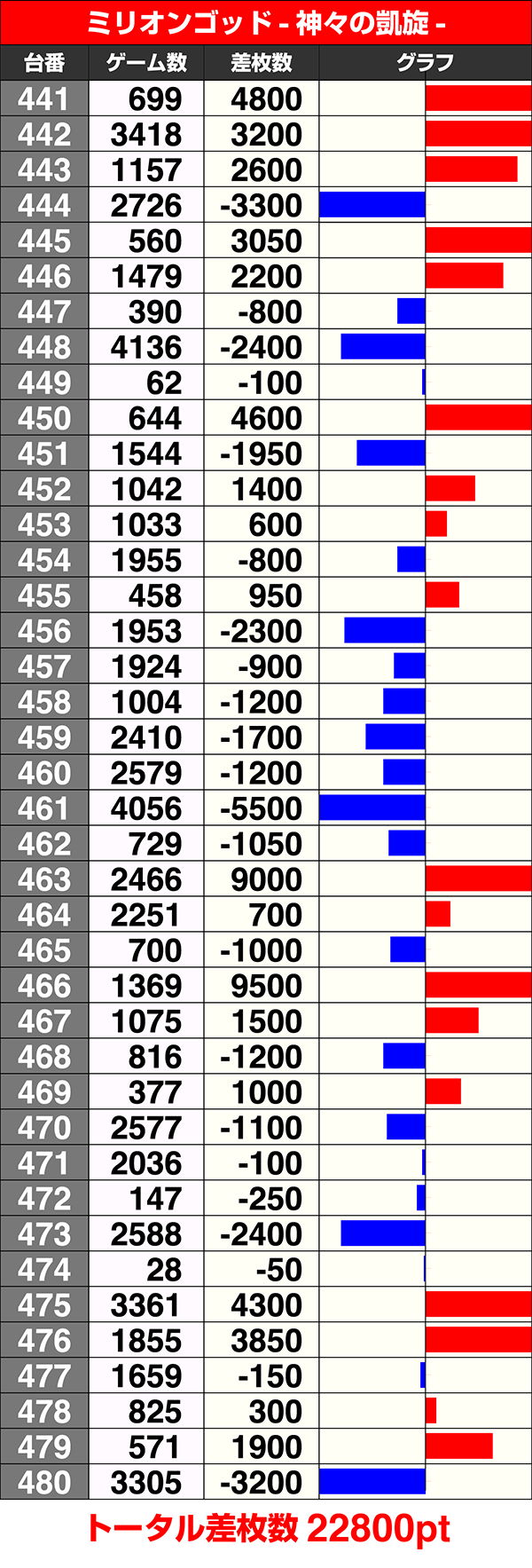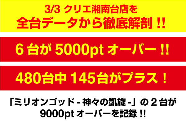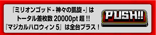『ミリオンゴッド-神々の凱旋-』は40台中18台がプラスで、3000ptオーバーは8台。463番台は9000pt、466番台は9500ptを記録した。