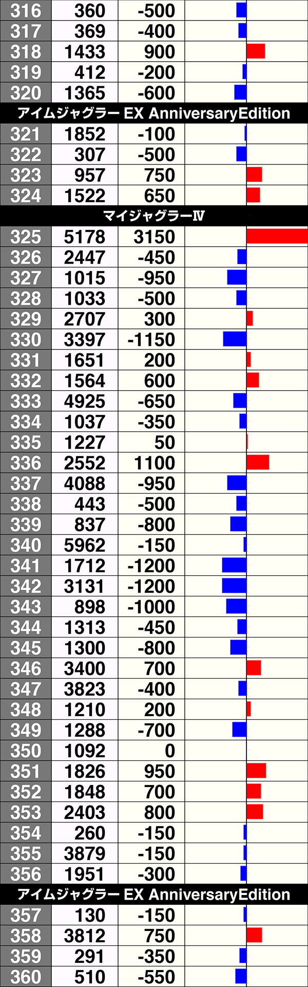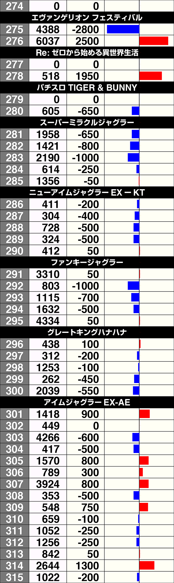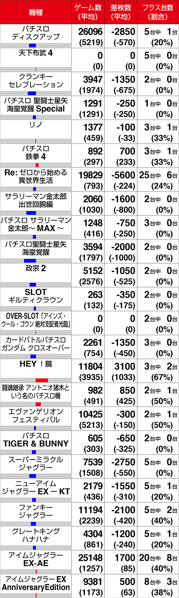 ジャグラーシリーズでは『アイムジャグラーEX-AE』が8台プラスで、トータル差枚数もプラスであった。