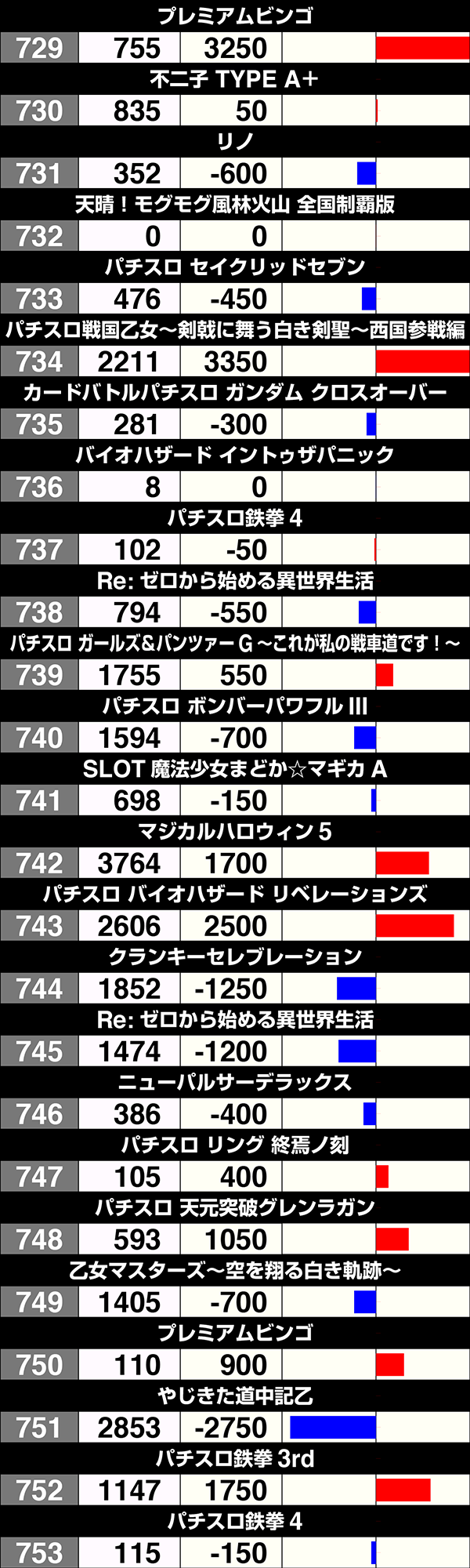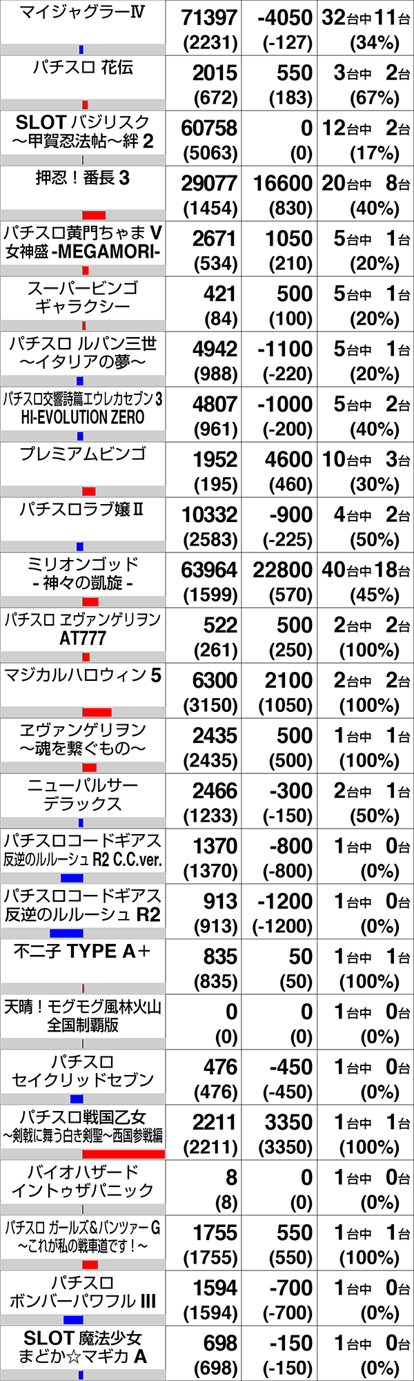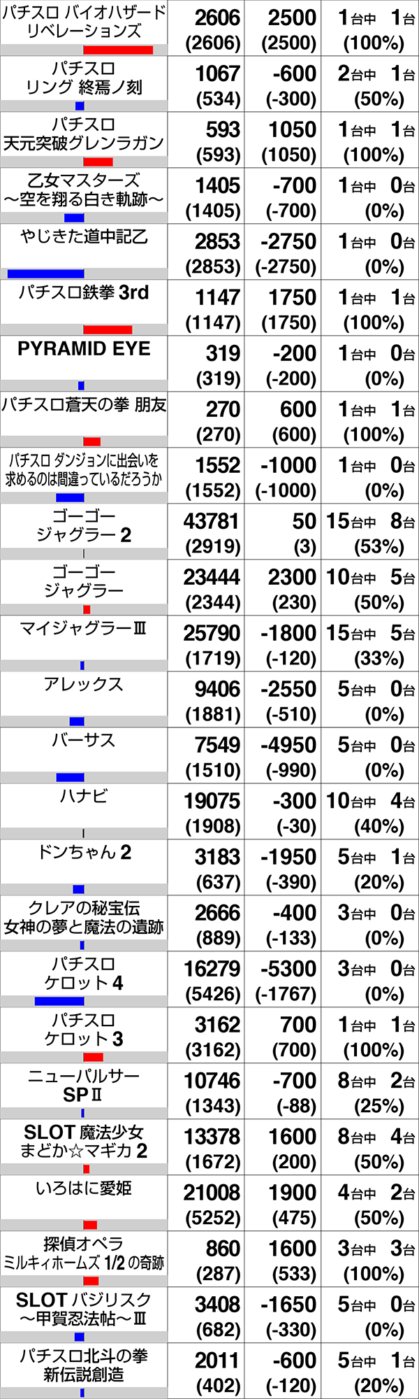パチスロ全体で145台がプラスを記録し、2台以上設置されている機種でプラス台数の割合が50%以上だったのは14機種。そのうち、3機種は全台プラスであった。
