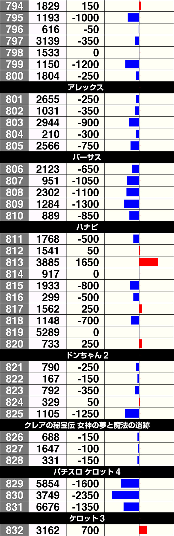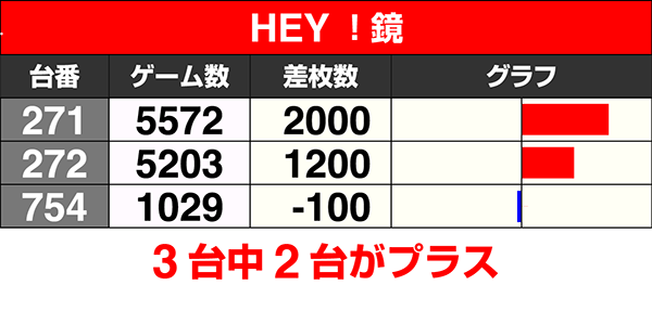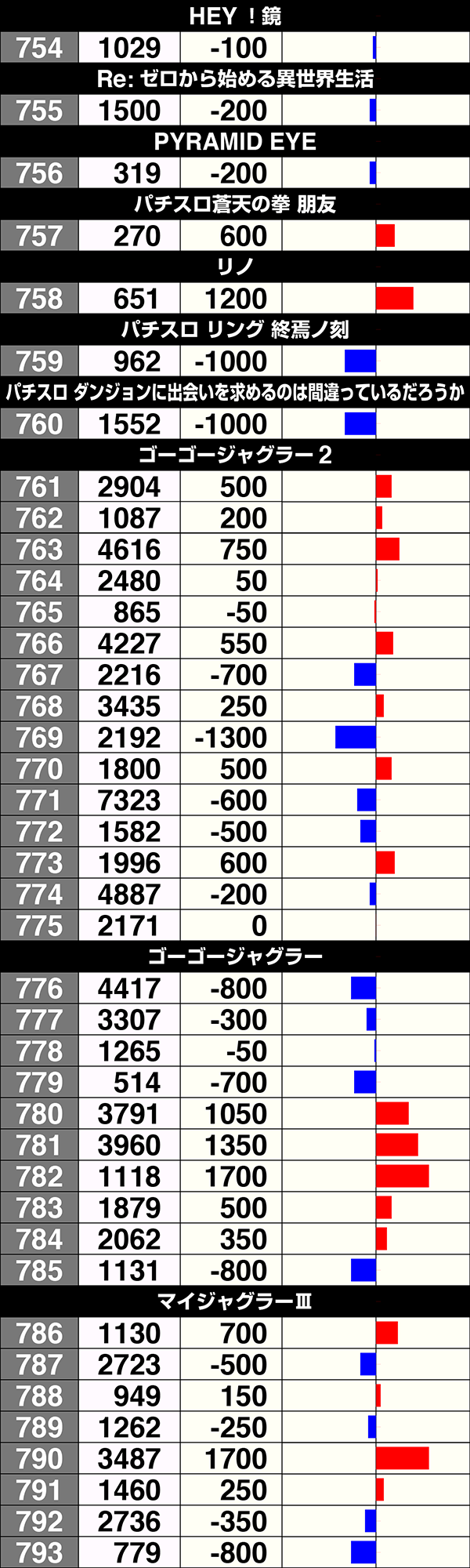 15台中8台プラスの『ゴーゴージャグラー2』は761番台から764番台までが4台並びでプラス、10台中5台プラスの『ゴーゴージャグラー』は780番台から784番台までが5台並びでプラスであった。