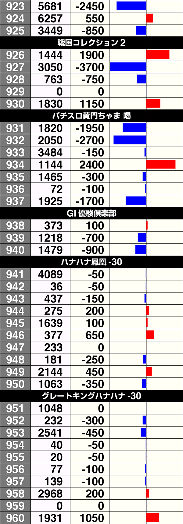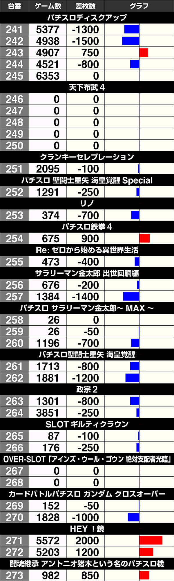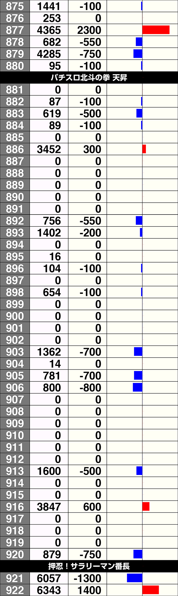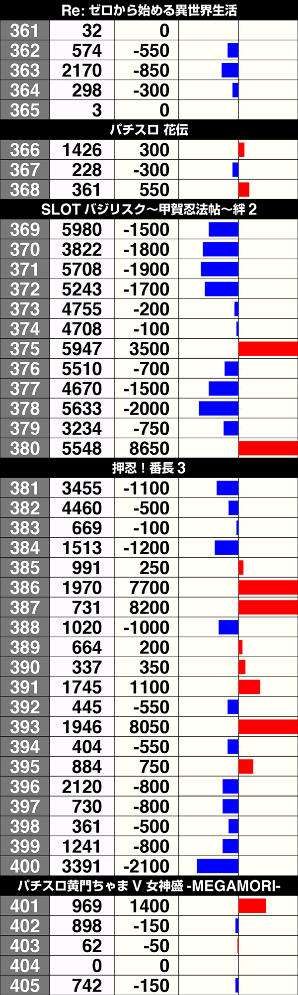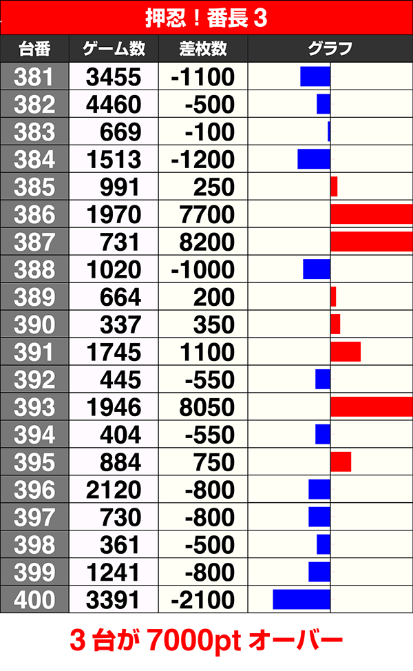 『押忍!番長3』はプラスである8台のうち3台が7000pt超。もっともプラスptが多いのは、8200ptの387番台であった。