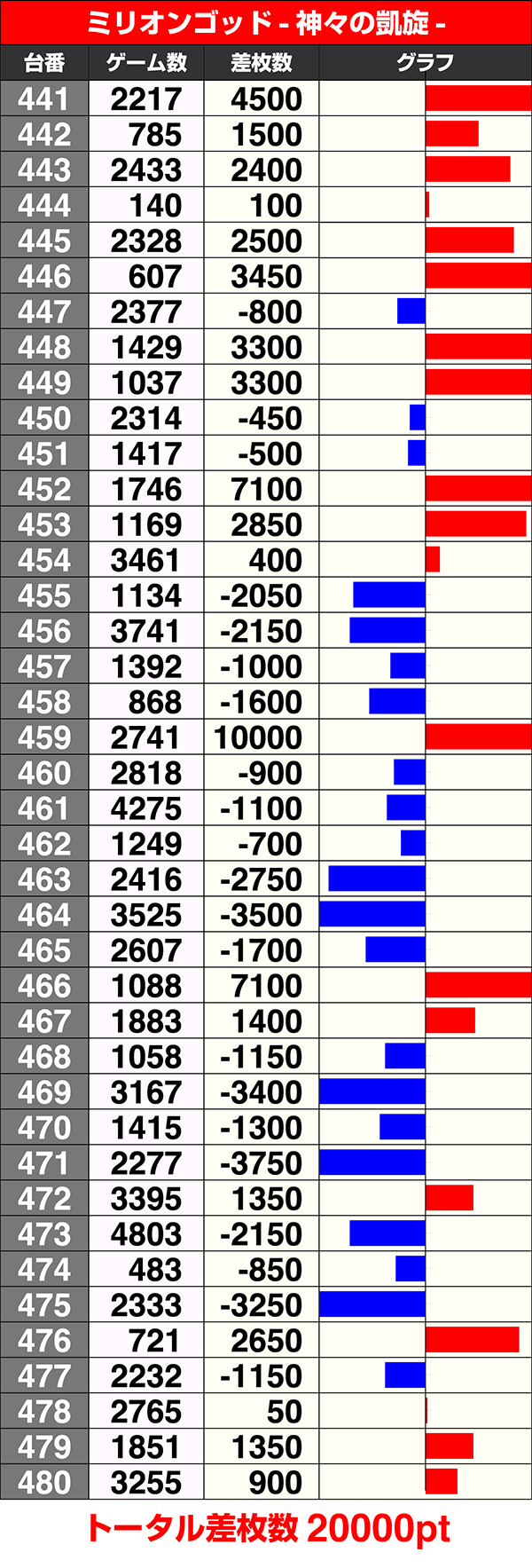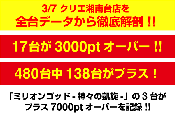 『ミリオンゴッド-神々の凱旋-』は40台中19台がプラスで、トータル差枚数は20000pt。2000ptを上回る台は11台あり、そのうち3台は7000ptを超えた。