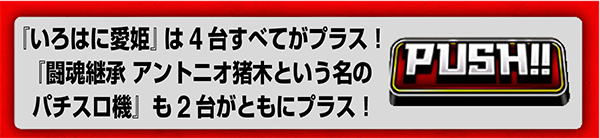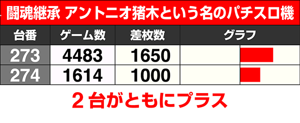 2台設置の『闘魂継承 アントニオ猪木という名のパチスロ機』も両台ともにプラスptをマーク。
