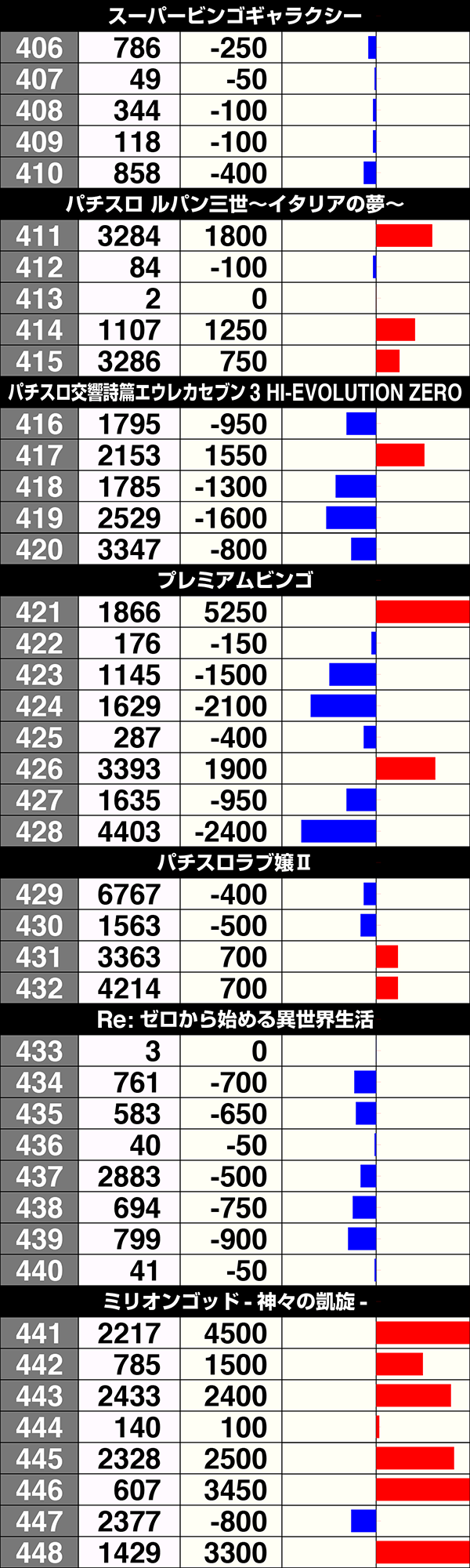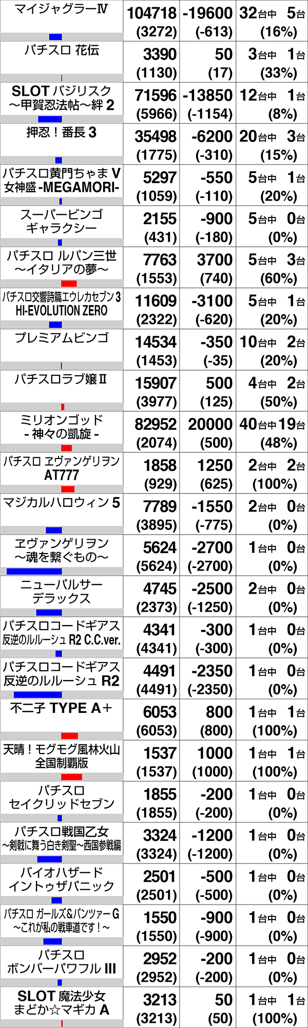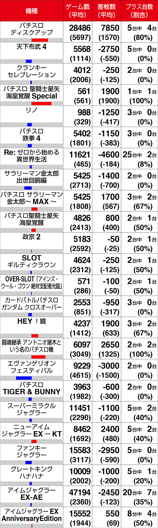 パチスロ全体で138台がプラスを記録し、2台以上設置されている機種でプラス台数の割合が50%を超えたのは18機種。そのうち3機種は全台プラスであった。