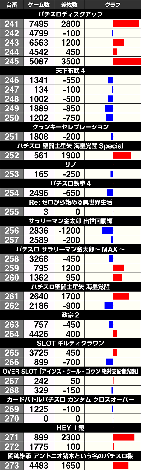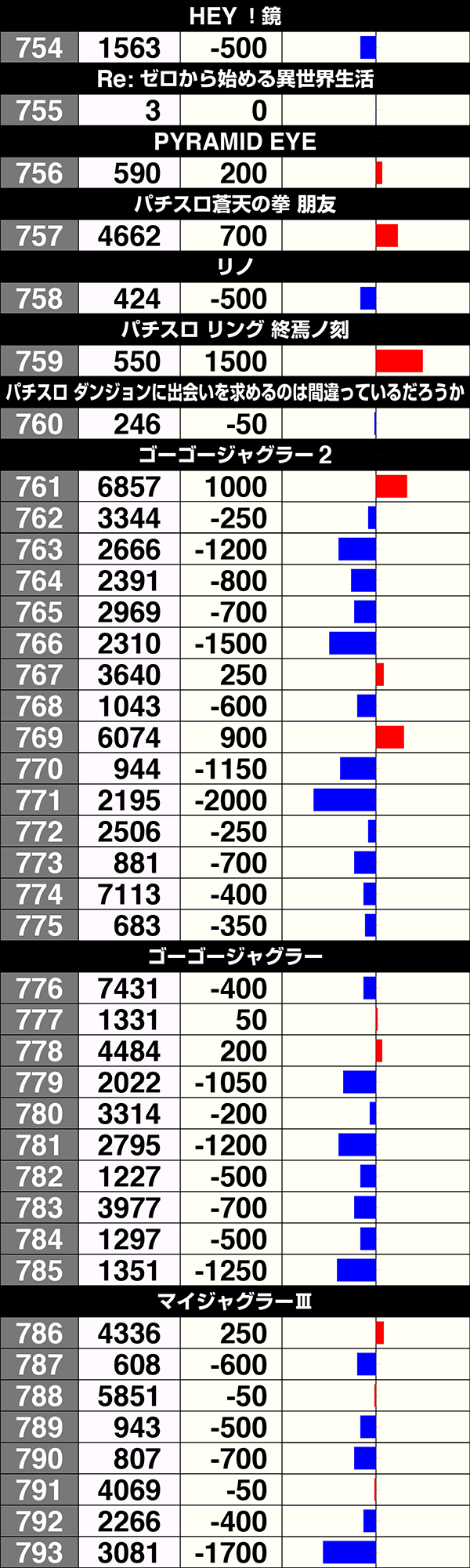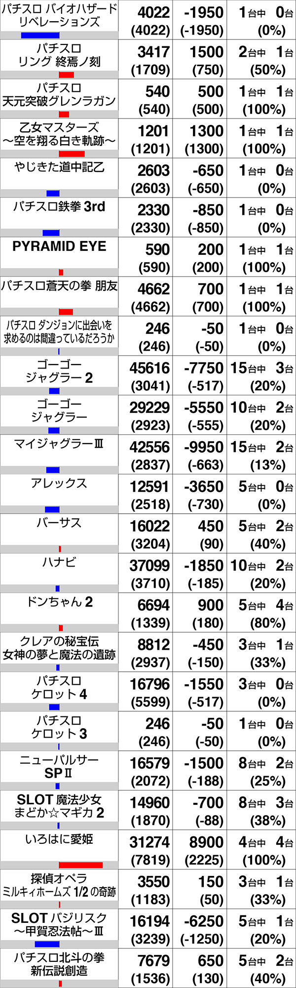 『HEY!鏡』は設置されている2台がともにプラスで、『パチスロ サラリーマン金太郎~MAX~』は3台中2台がプラス。
