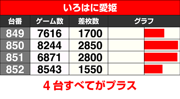 新台の『いろはに愛姫』は4台すべてがプラス。すべての台が6000Gオーバーで差枚数は1500ptを上回った。