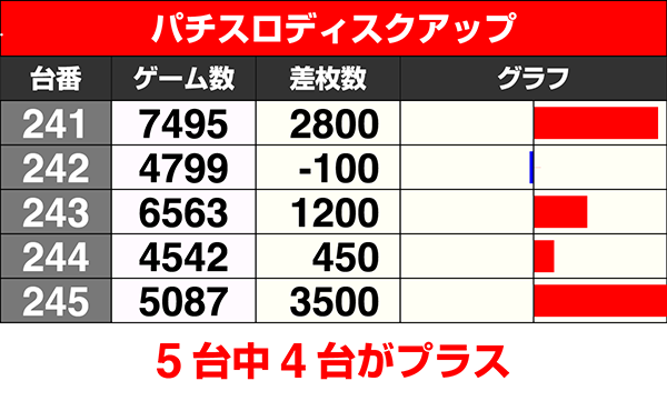 『パチスロディスクアップ』は設置されている5台のうち4台がプラス。平均ゲーム数は5697Gであった。