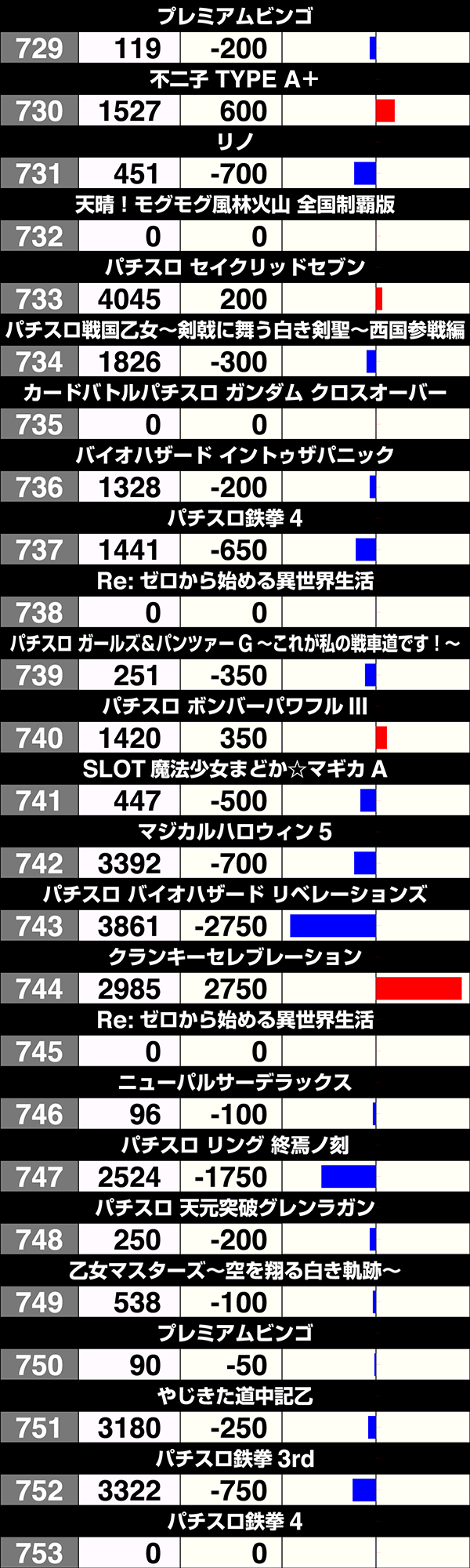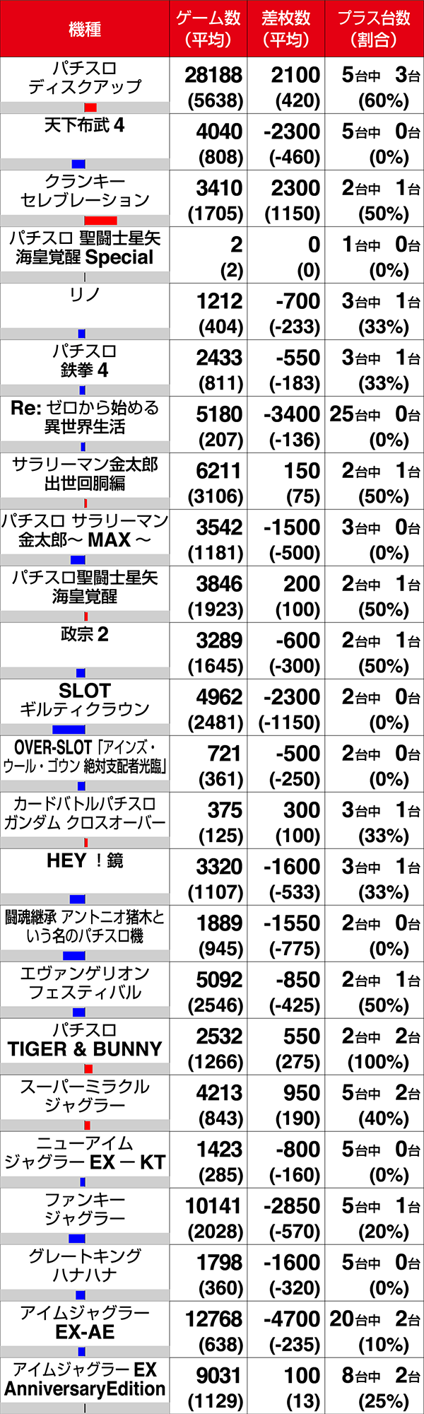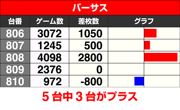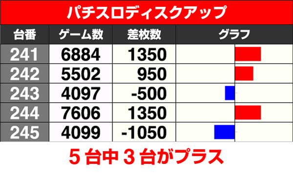 5台設置の『バーサス』と『パチスロディスクアップ』はどちらも3台プラスで、2000ptを上回る台もあった。